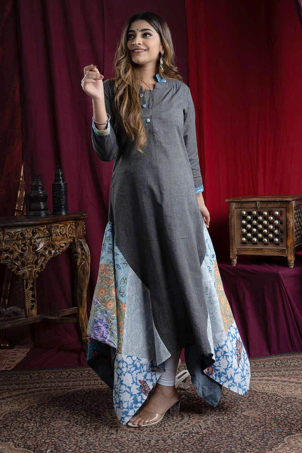 The lehenga is three-piece attire consisting of a long skirt, blouse, and...
