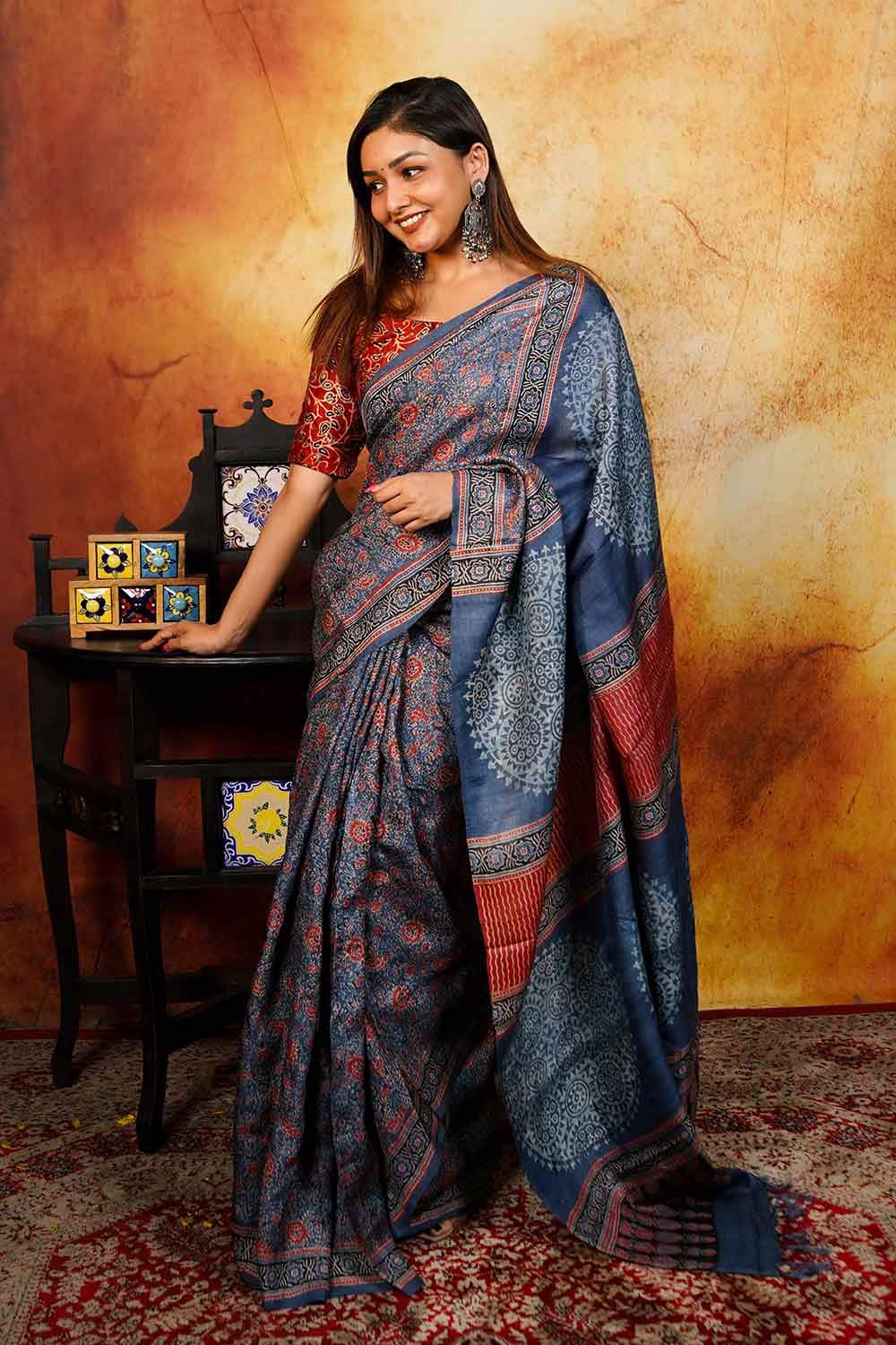 Ajrakh Hand Block Printed Tussar Silk Saree