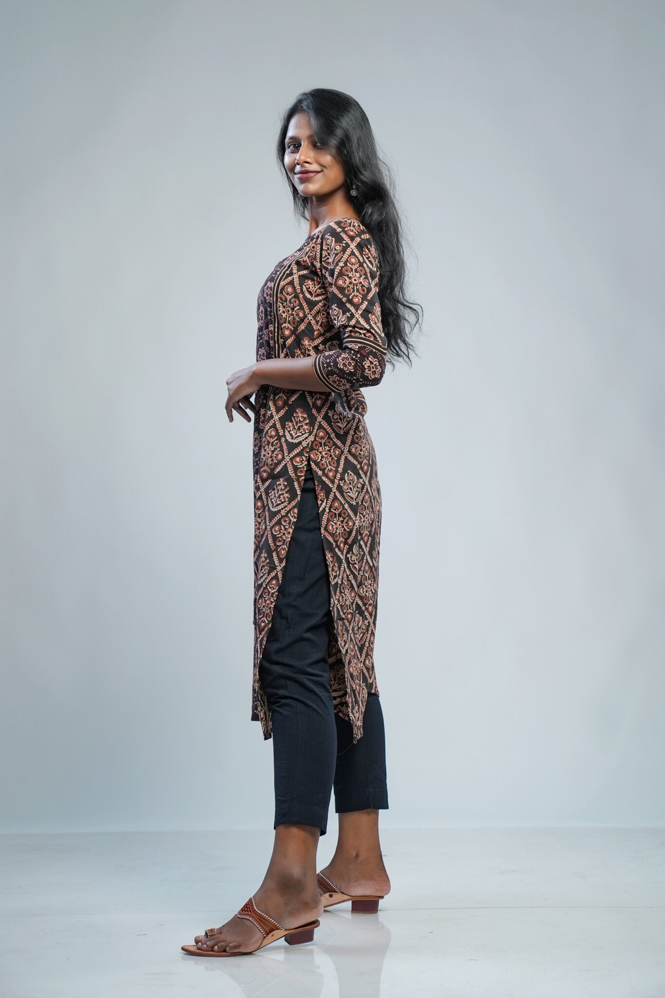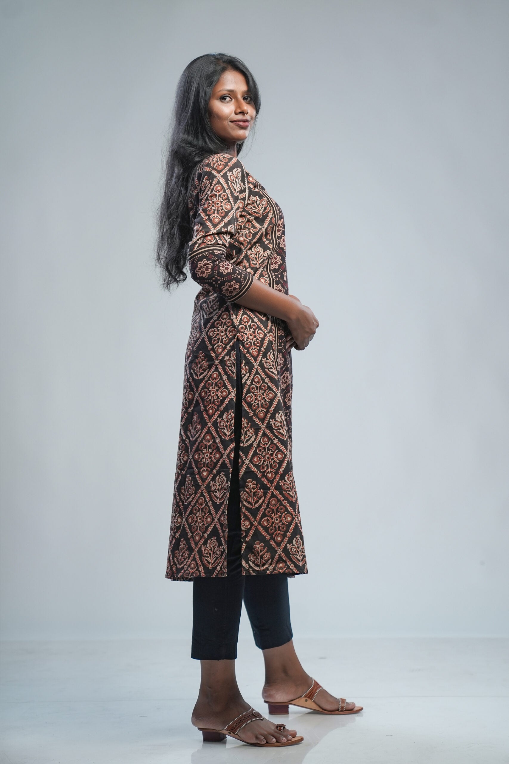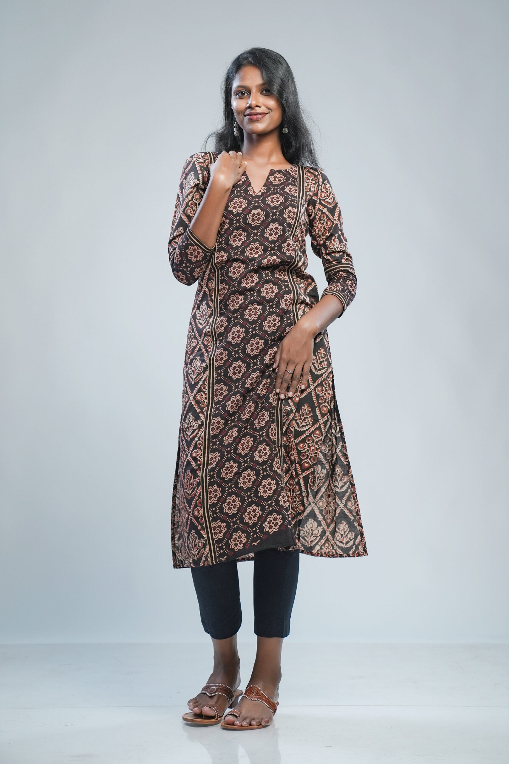 Round neck with knock Black Ajrakh Floral Panel Kurti with elbow sleeve