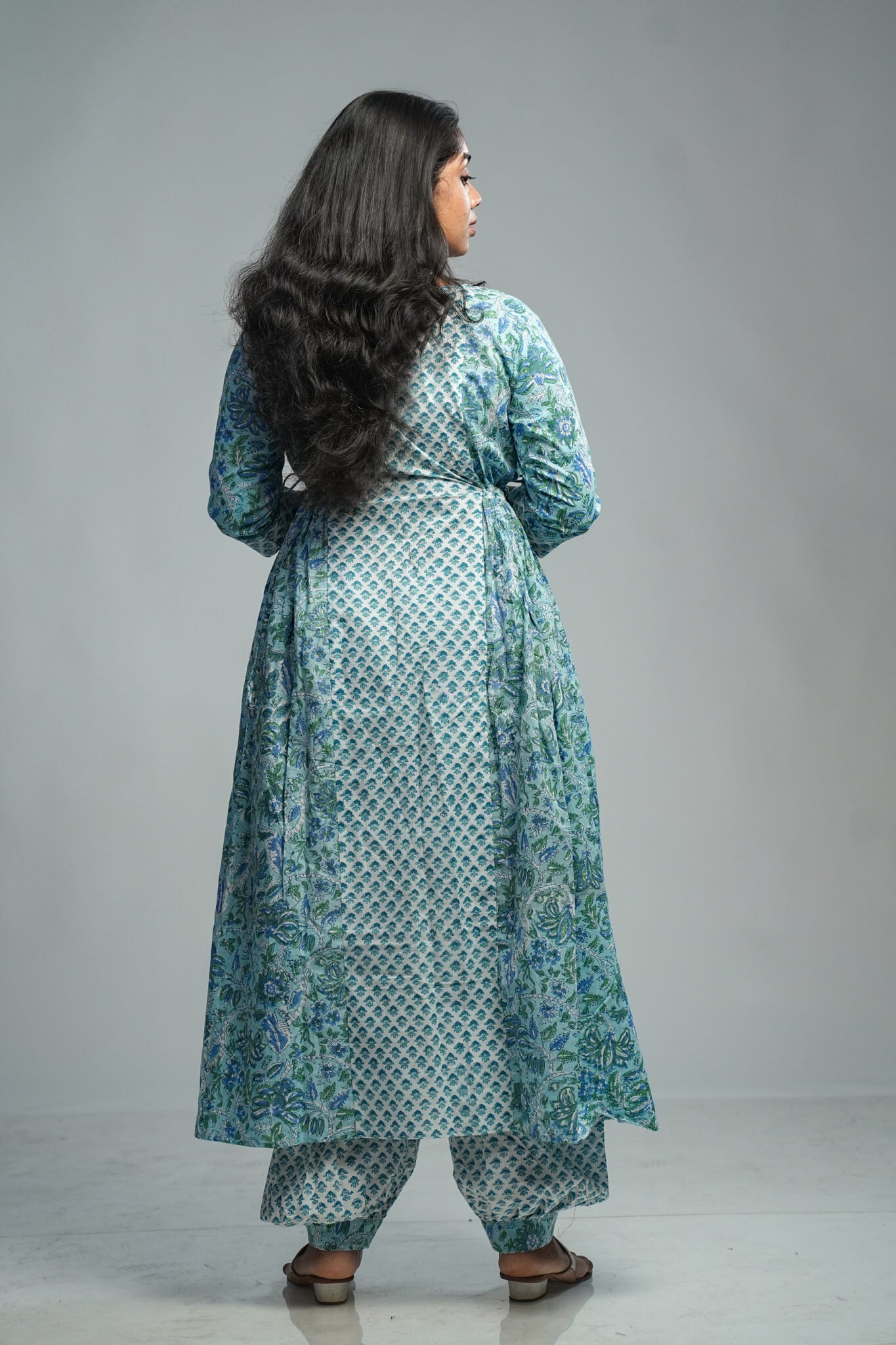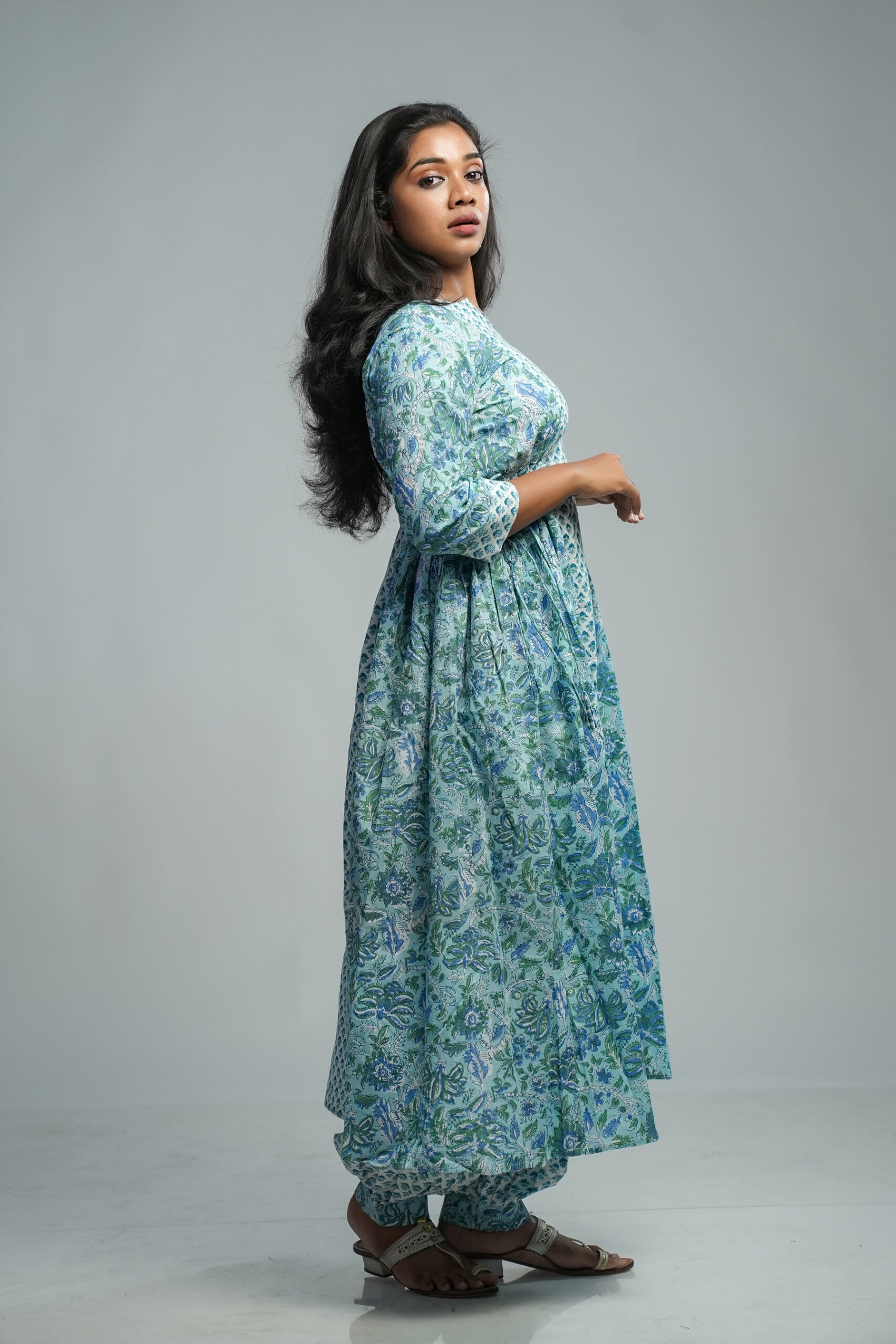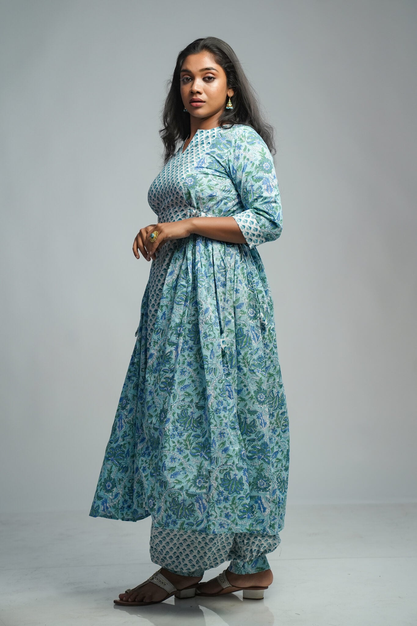 Ocean Blue Sanganeri Cotton Three Panel Kurti with Baloon Pants