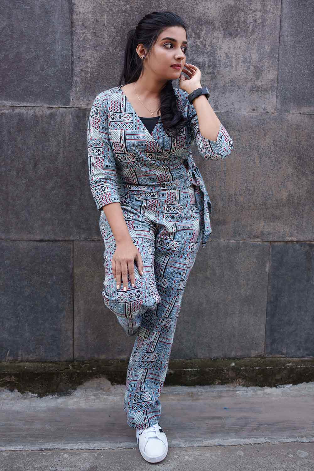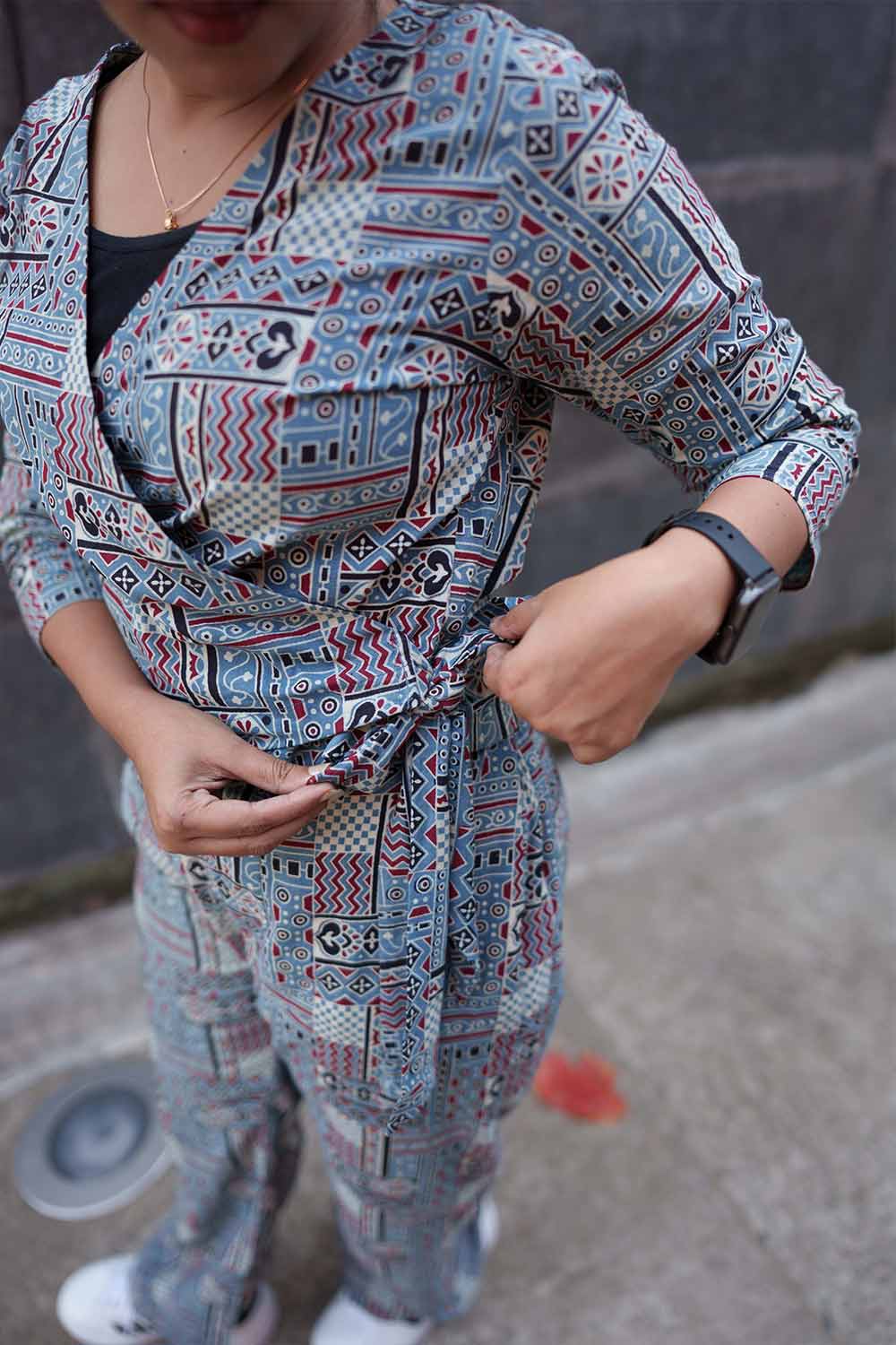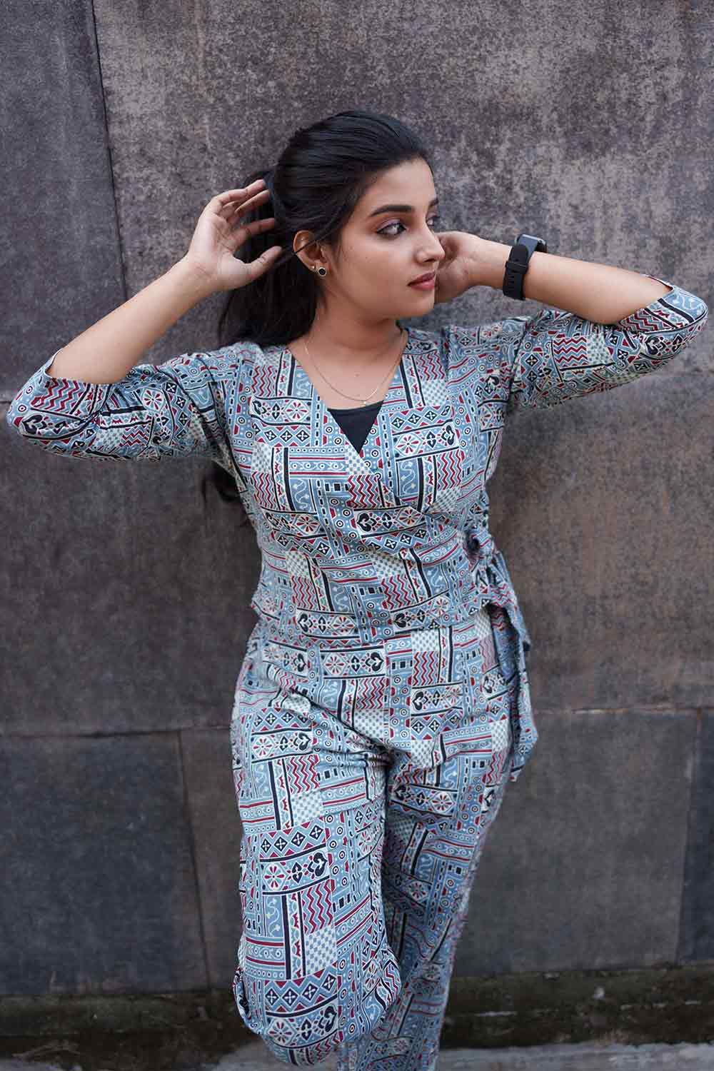 French Blue Ajrakh Printed Cotton Overlapping Top and Pants