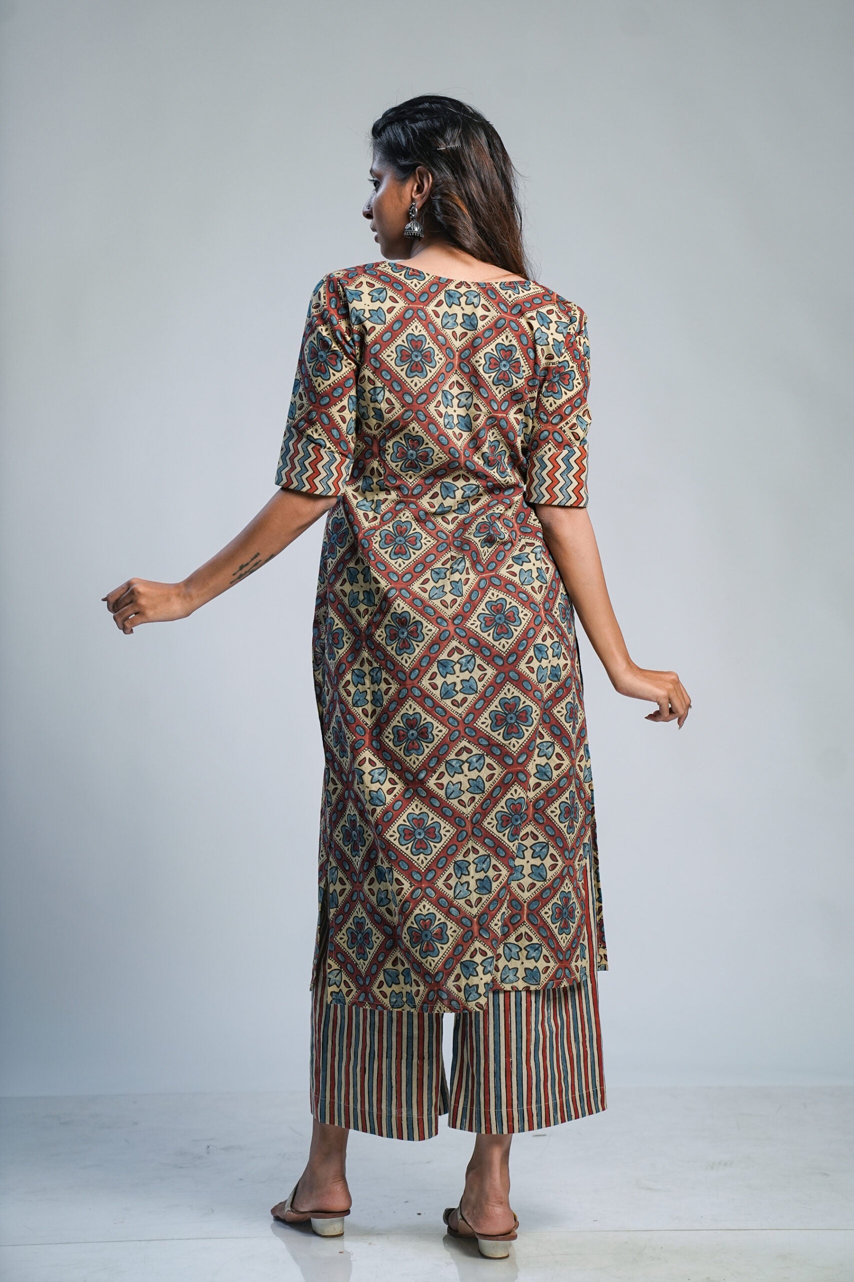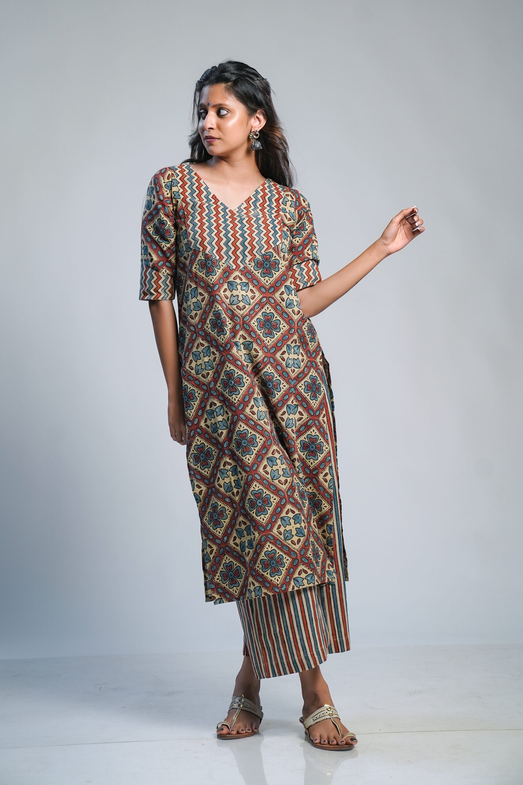 V neck Cream Ajrakh Zigzag Kurti with elbow length sleeve