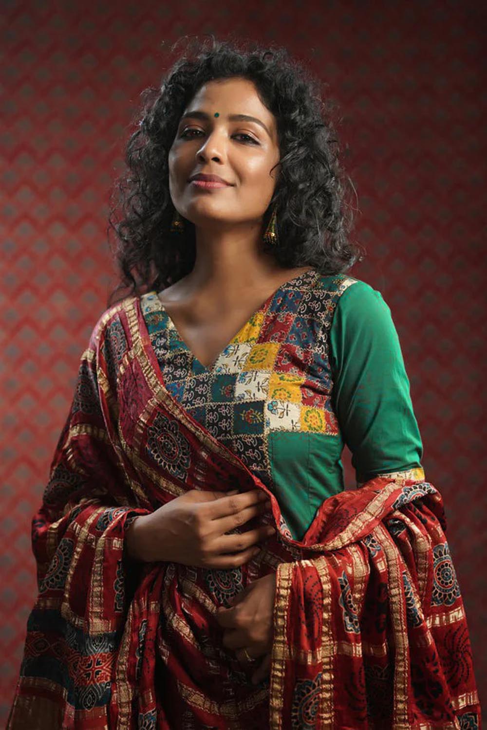 Forest Green Anarkali with Ajrakh Patch Yoke