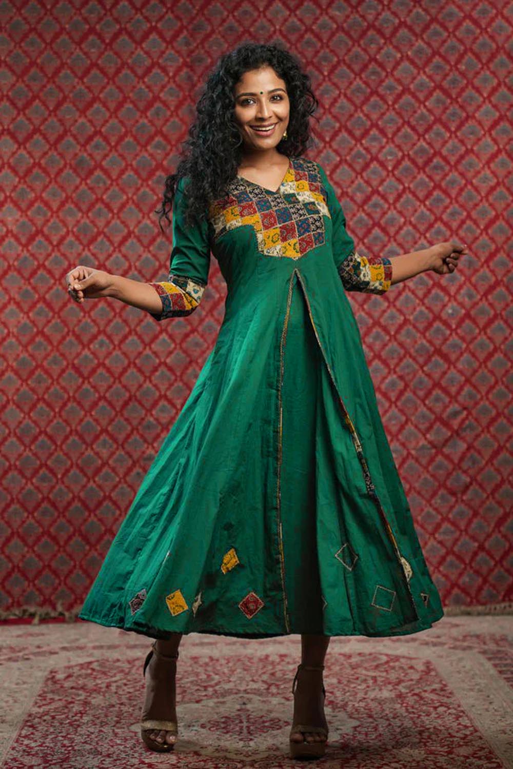 Forest Green Cotton Anarkali with Multi Color Ajrakh Embellished Patch Yoke and Front Slit