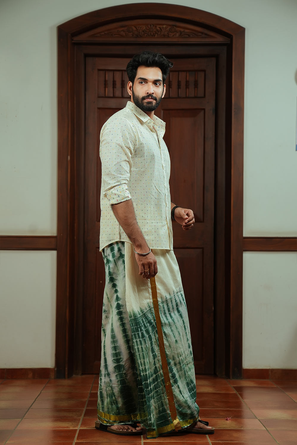 Shibori Dyed Kerala Dhoti with Golden Zari Border