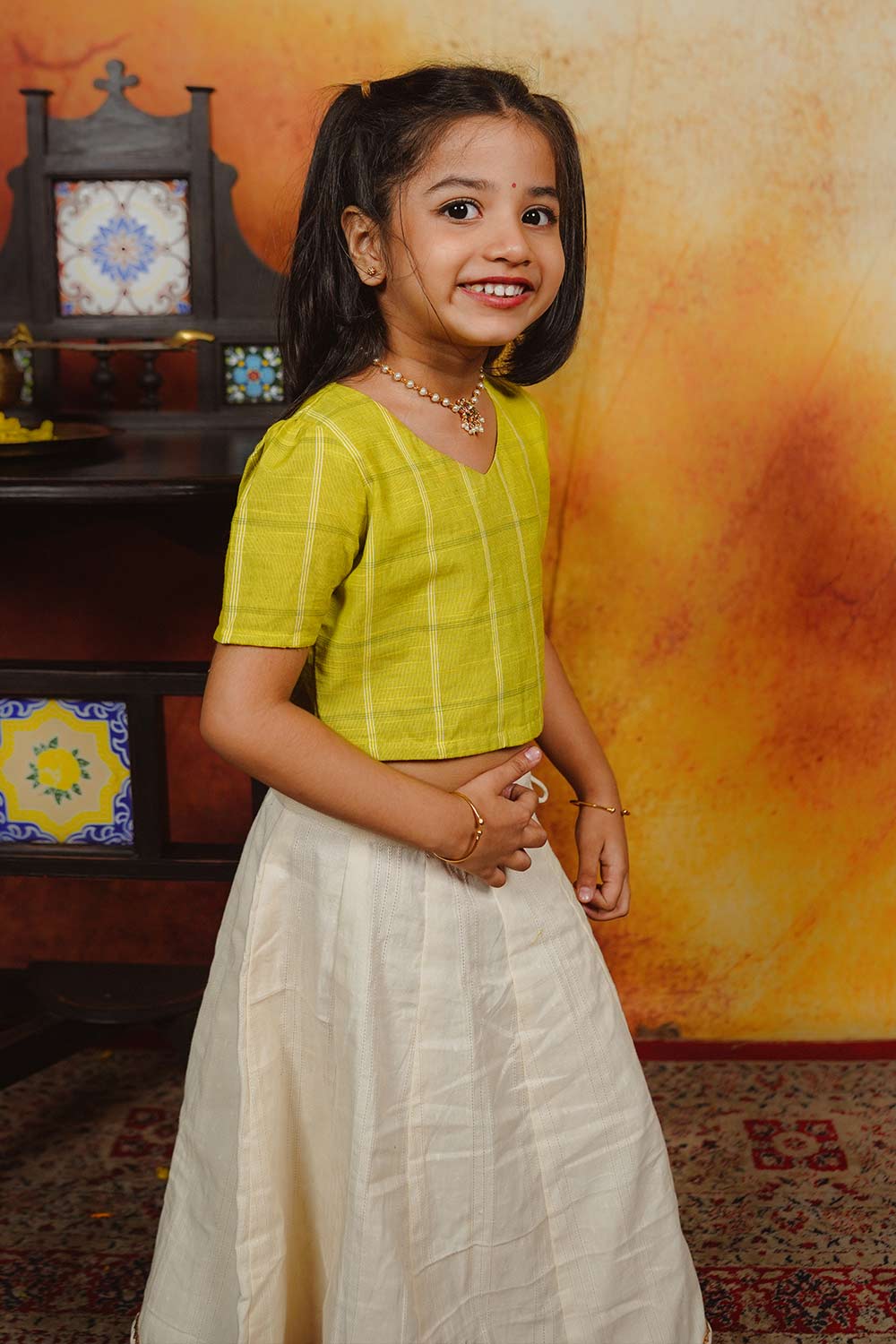 Green Puff Sleeve Top & Off-White Panelled Skirt