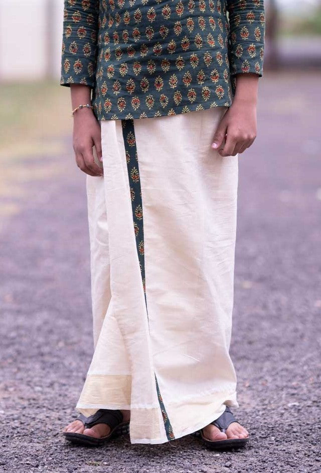Light Gold Mundu with Green Ajrakh Kara