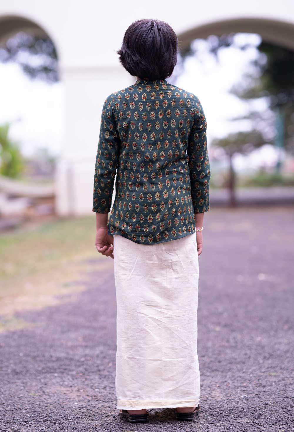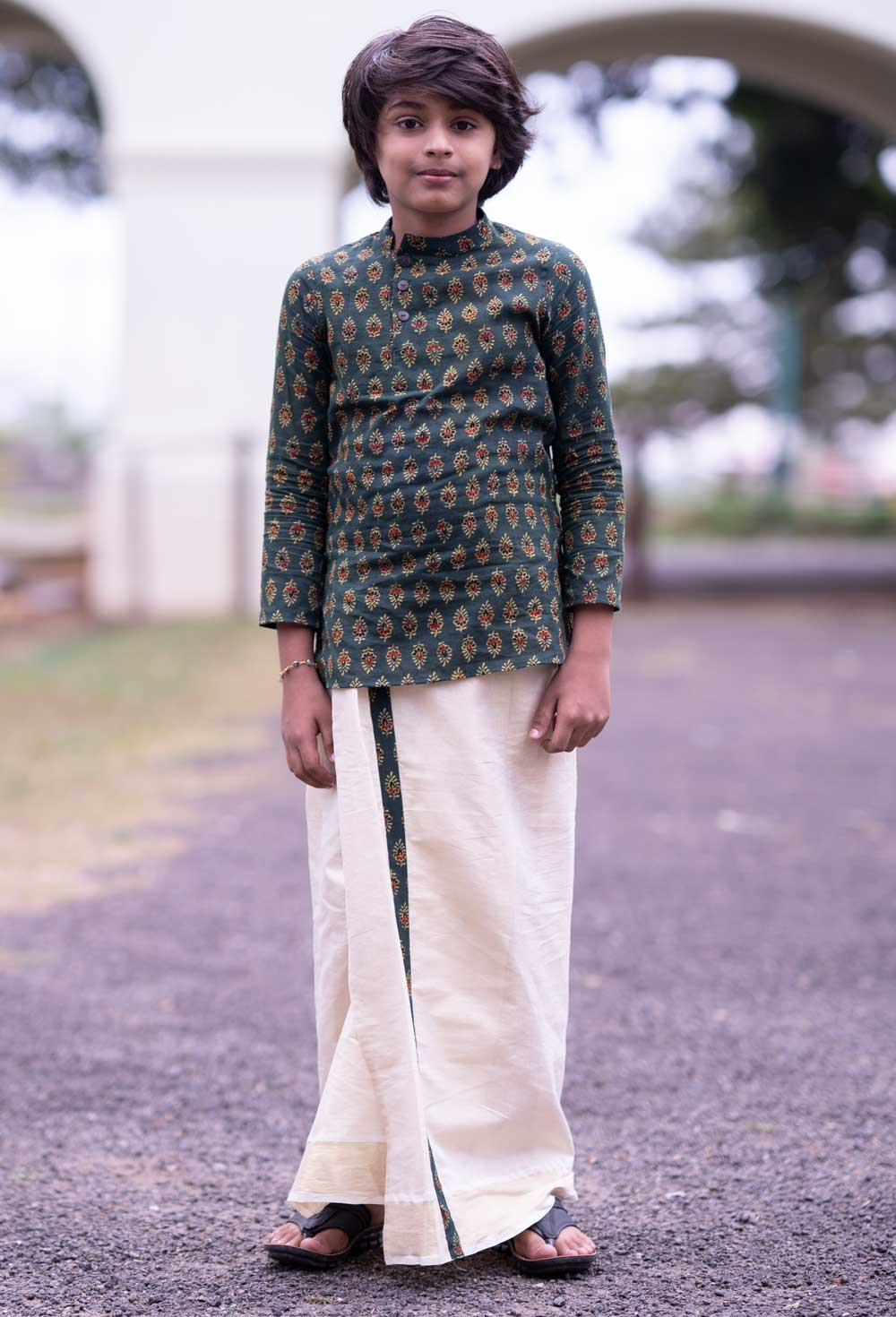 Light gold tissue mundu for boys with 7/8 inch green ajrakh kara.