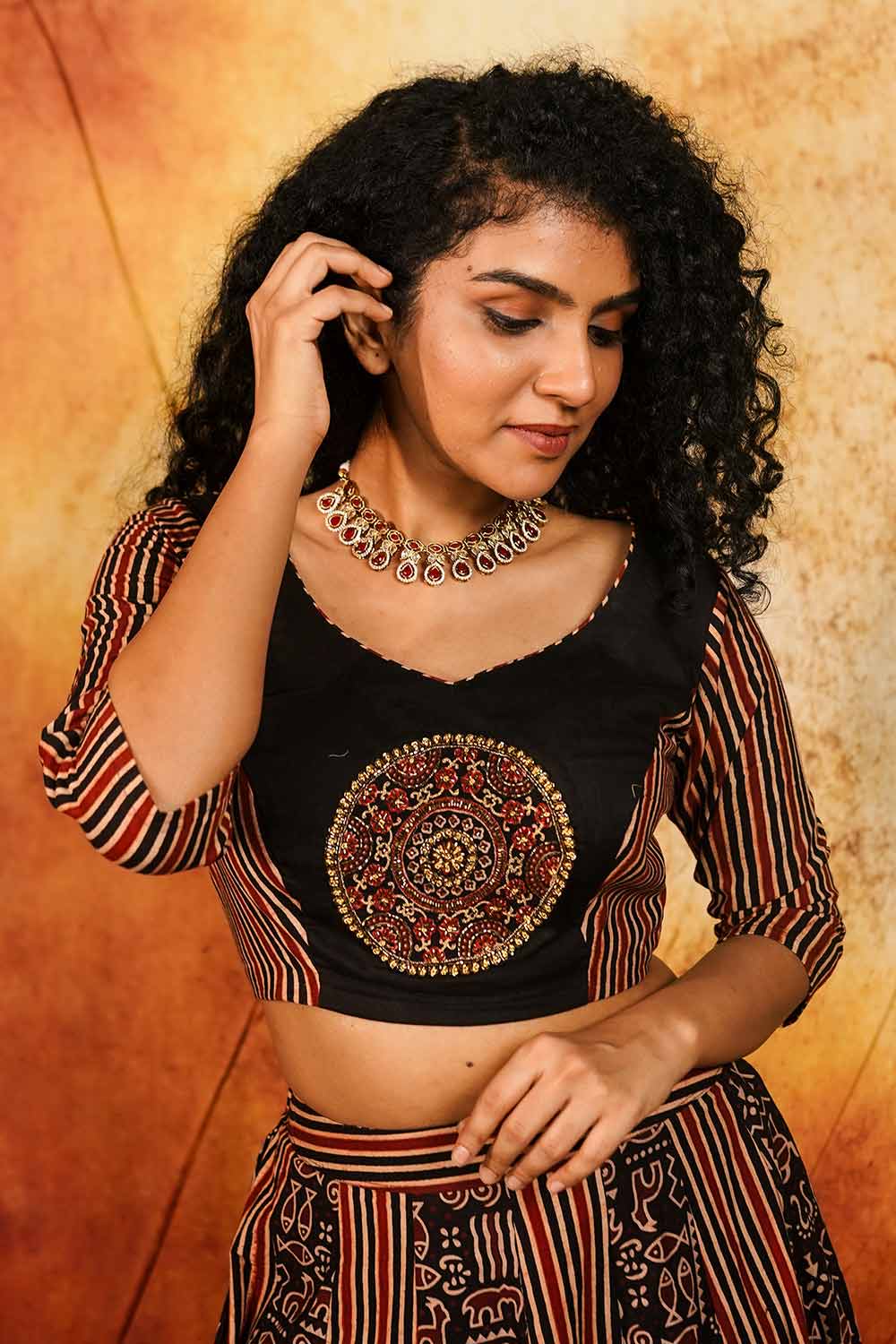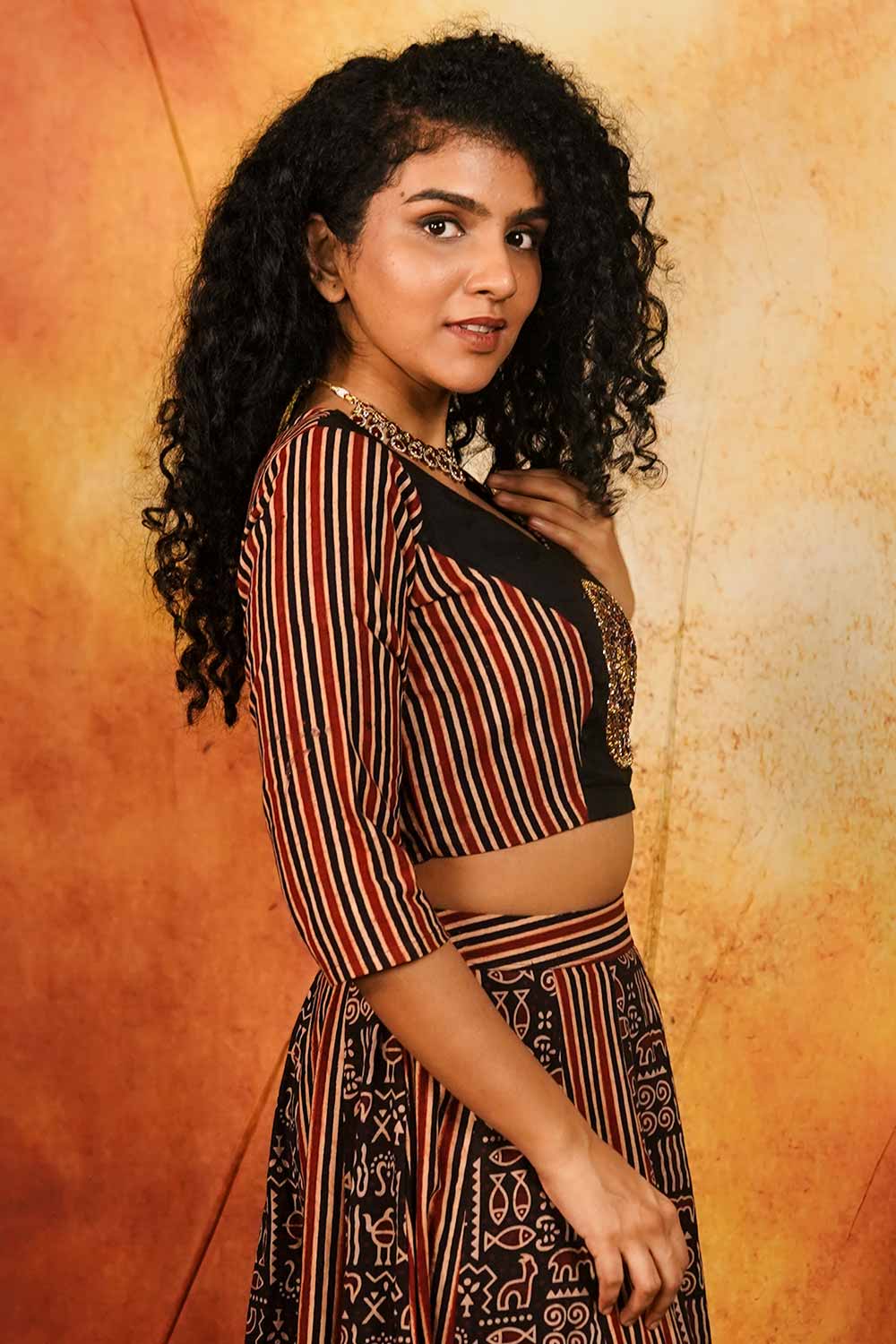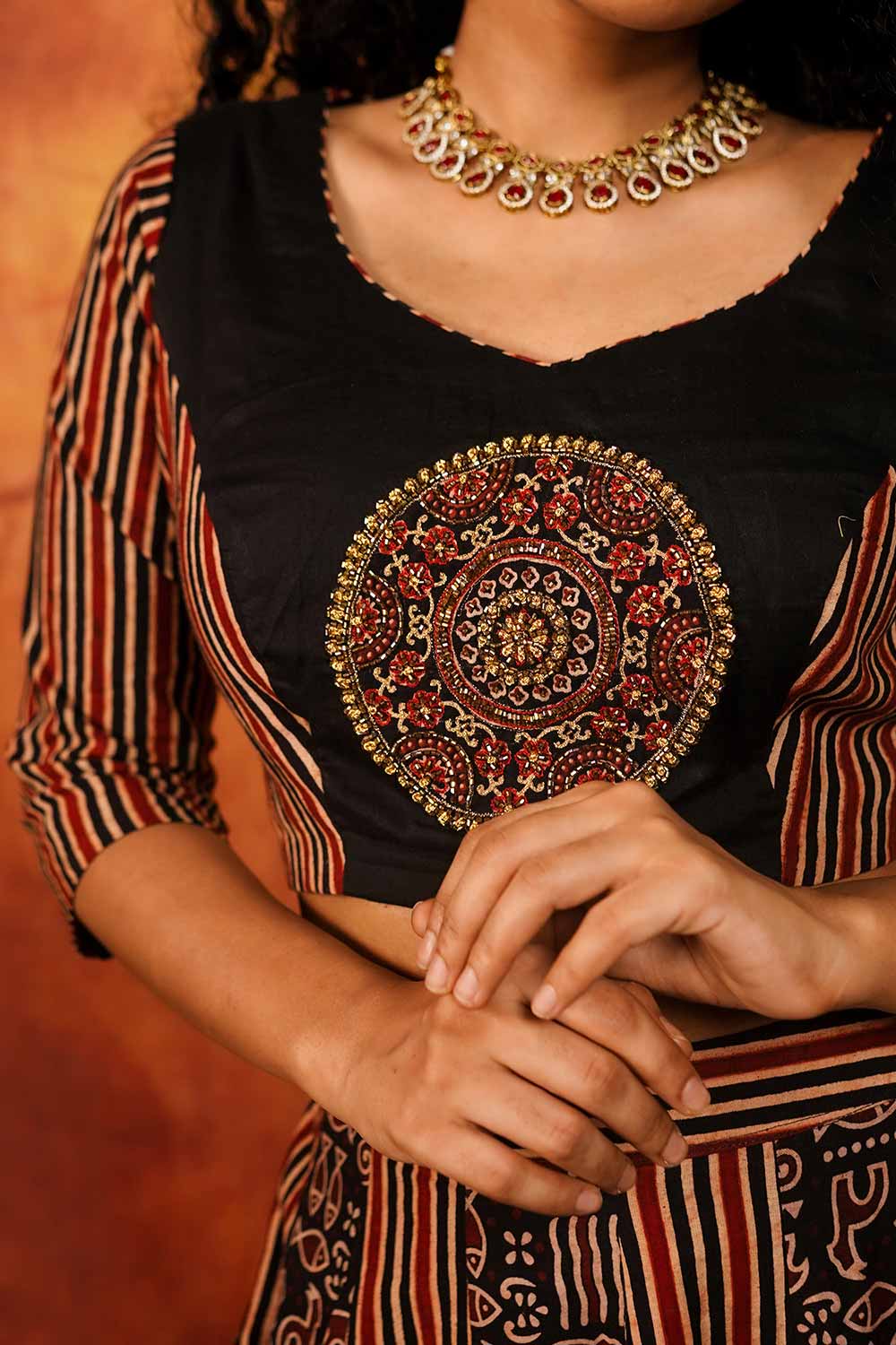 Maroon & Black Ajrakh Stripes Top with Embroidery