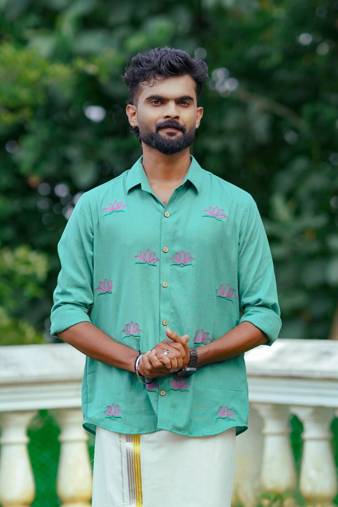 Mint Green Full Sleeve Shirt with Lotus Embroidery