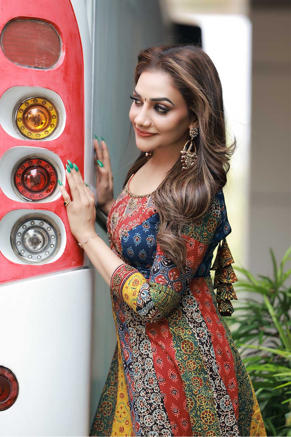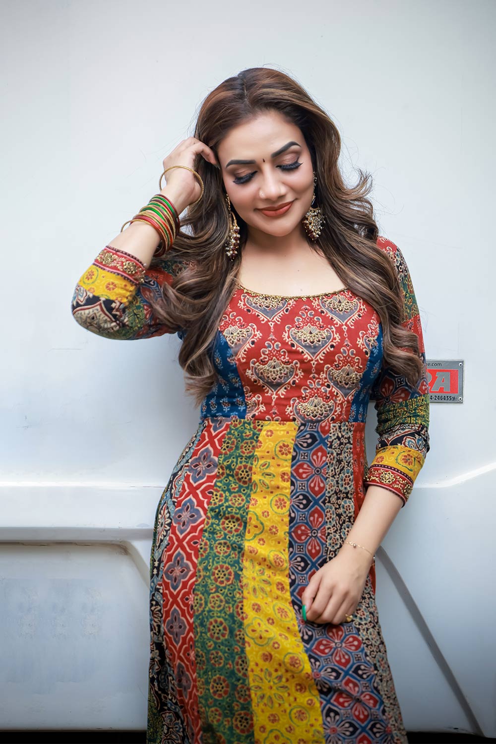 Multi Color Cotton Ajrakh Anarkali with embroidery detailing on yoke and sleeve
