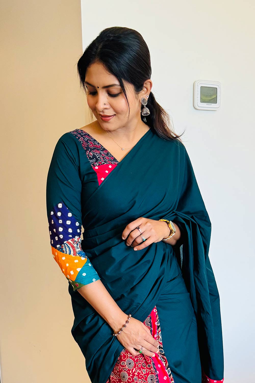 Peacock Green Mul Mul Cotton Blouse with Bandhani & Ajrakh Patch