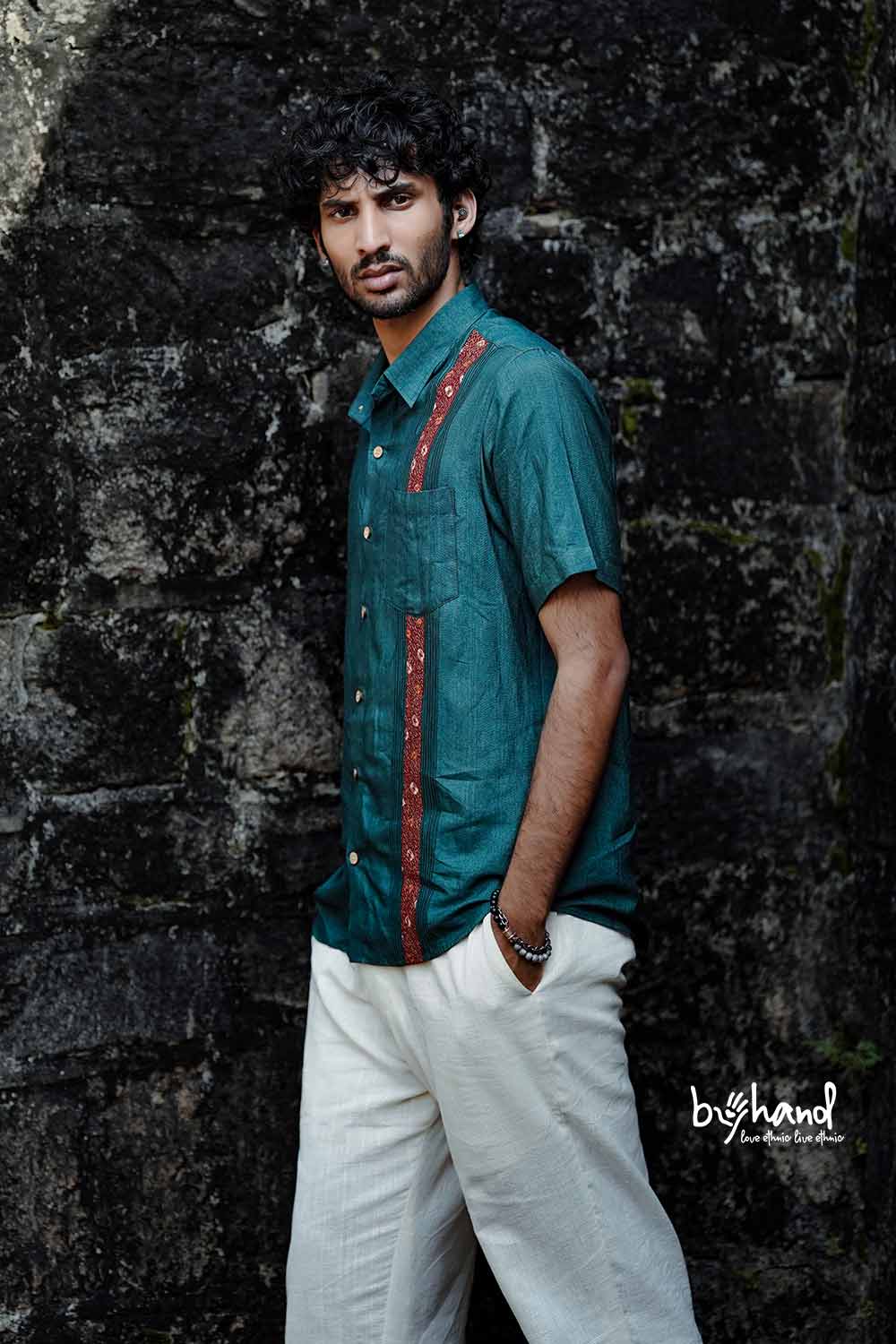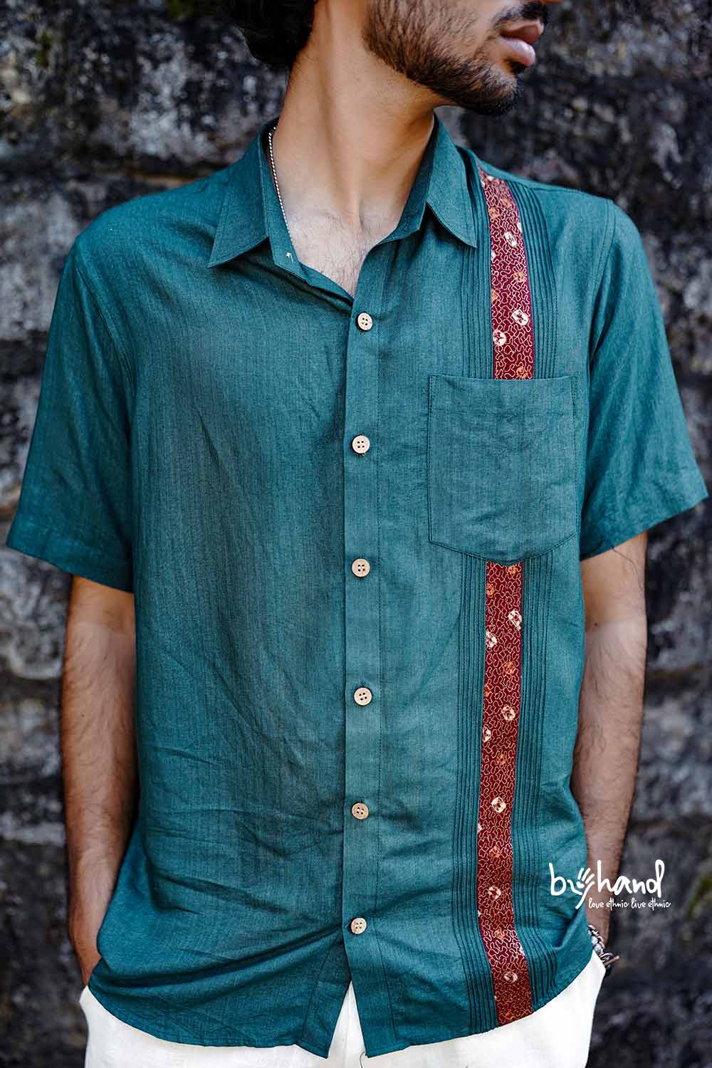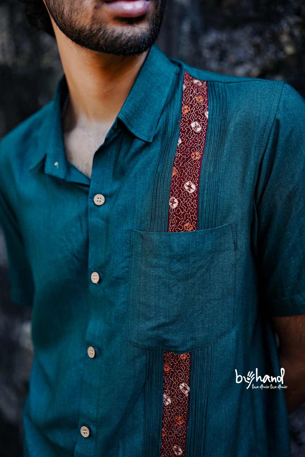 Slub Staple Dark Green Shirt With Pintuck And Bandhani Detailing
