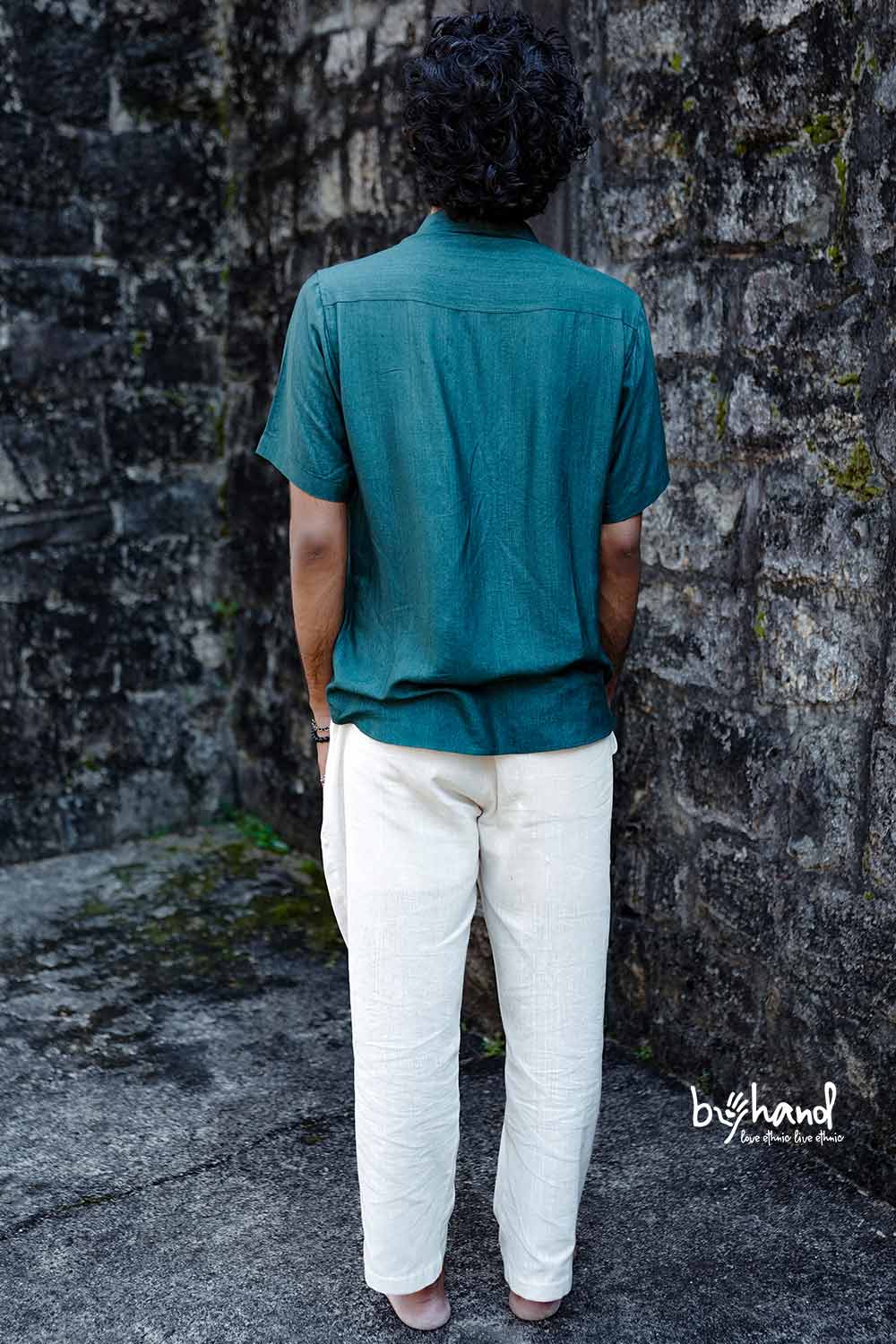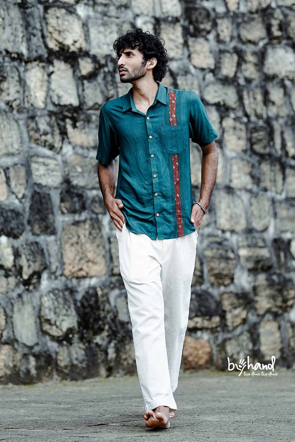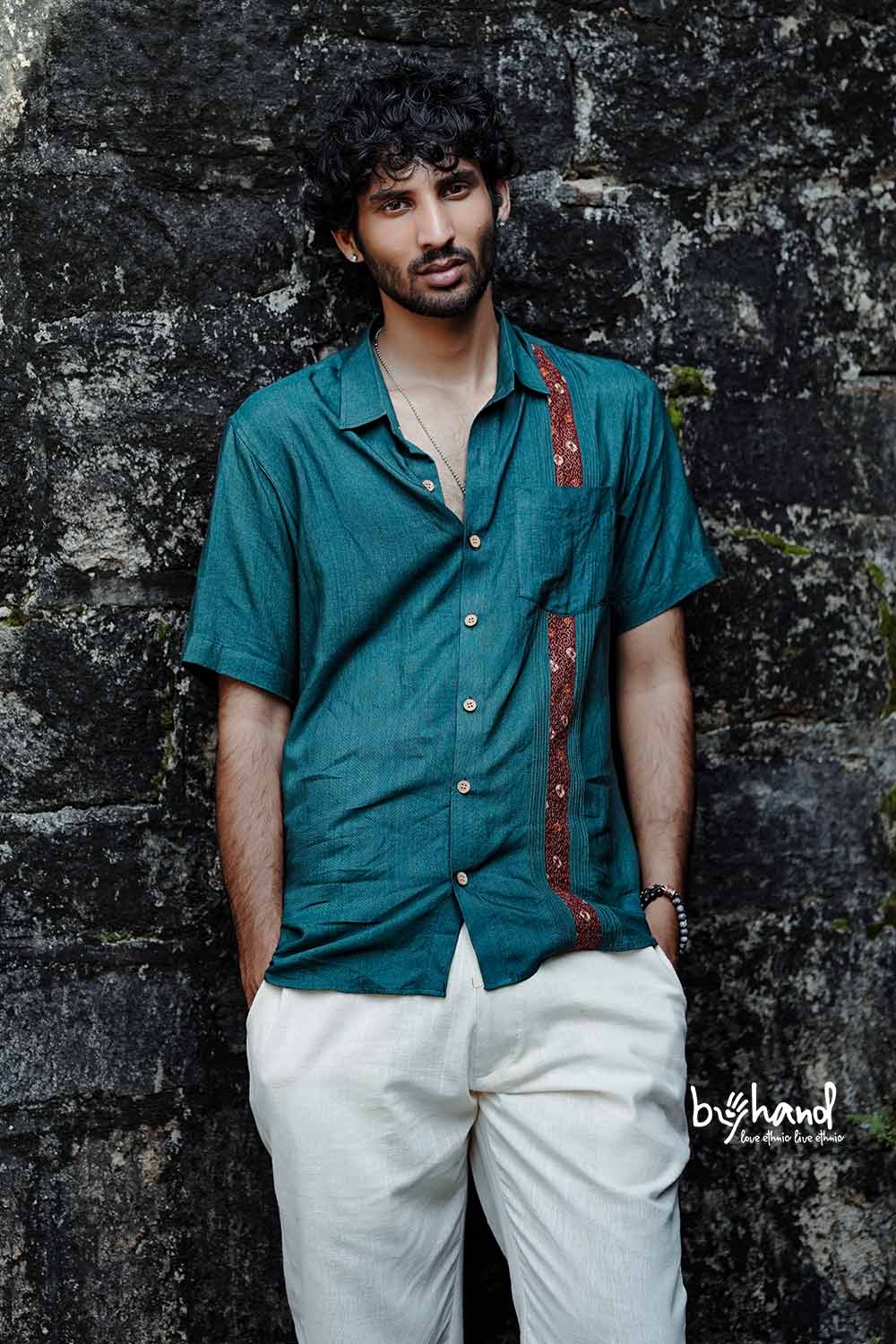 Slub Staple Dark Green Shirt With Pintuck And Bandhani Detailing
