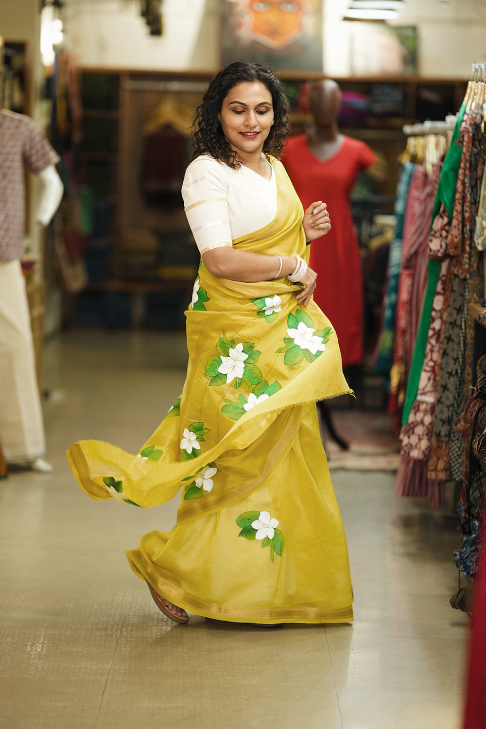 Yellow Handpainted Mantharam Saree